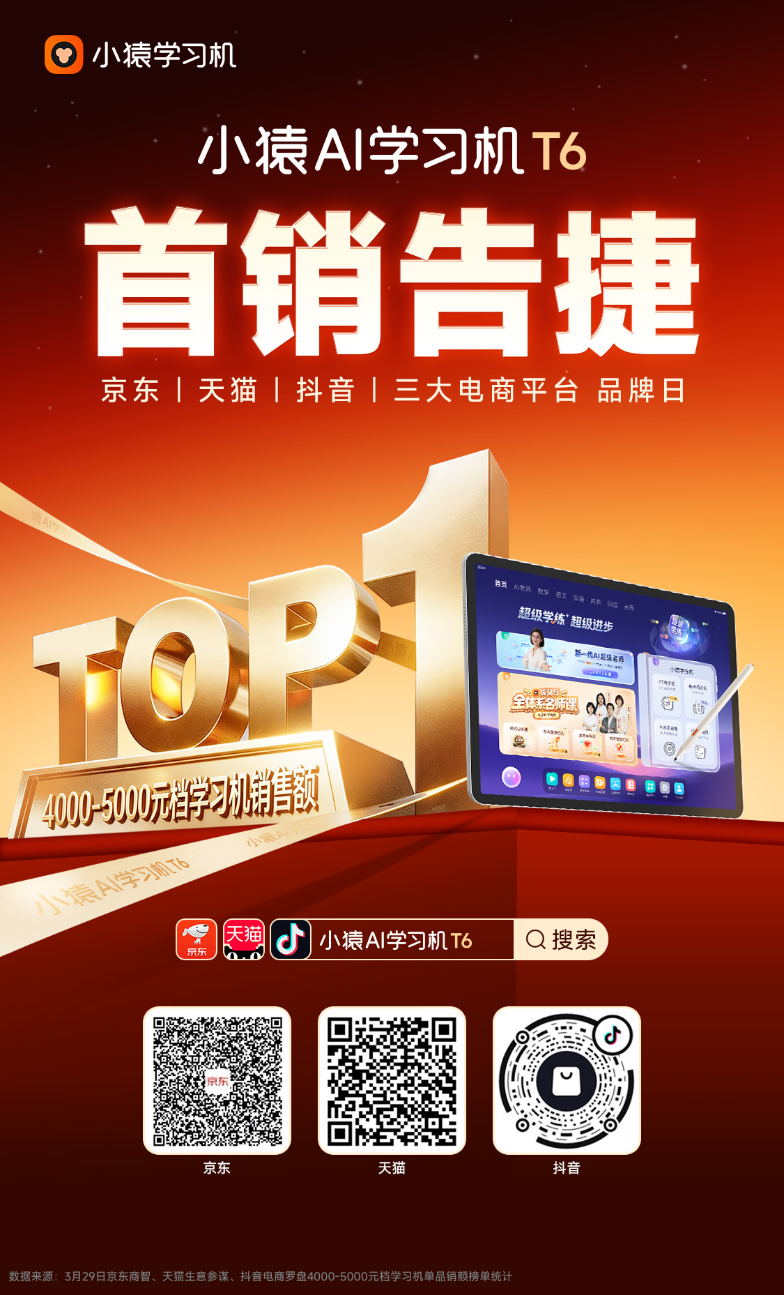 3月29日,刚刚发布的小猿AI学习机T6迎来品牌日,凭借强劲的市场表现一举斩获京东、天猫、抖音三大主流电商平台4000-5000元档学习机销售额第一名,成为该价格段内最受消费者青睐的学习机产品。这一成绩不仅彰显了T6学习机强大的产品力,也进一步印证了市场对AI赋能学习效果提升的普遍认可。