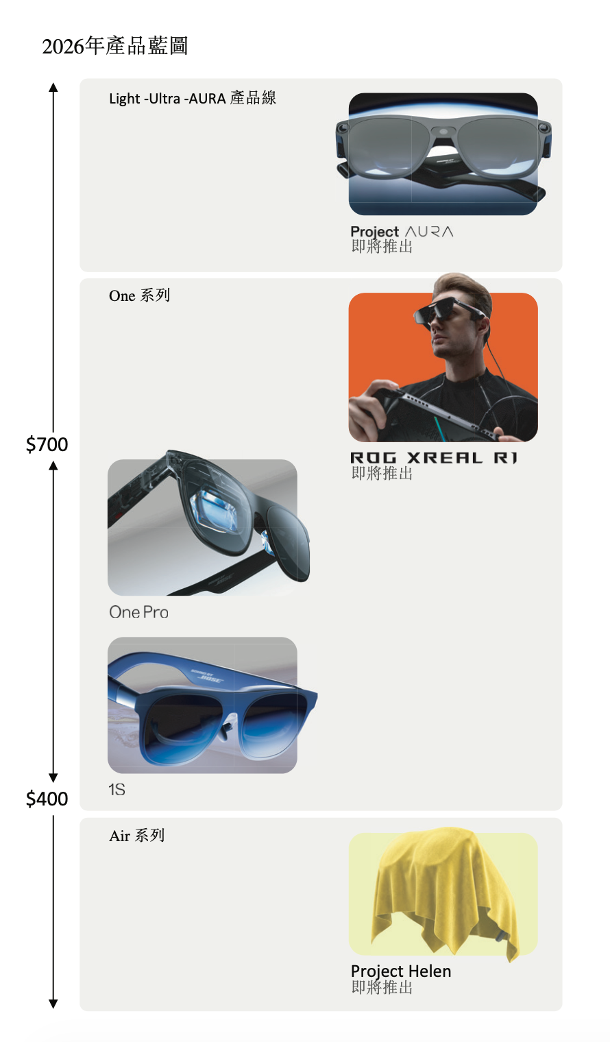 在技术与产品层面,XREAL构建了“自研光机+自研芯片”的核心护城河,旗下Air系列与One系列产品广受全球消费者认可。面对2026年的市场机遇,XREAL公布了全产品线矩阵蓝图,包括:面向大众市场的普及型眼镜“Project Helen”;与顶级电竞品牌ROG(玩家国度)合作的专业电竞眼镜“R1”;以及与Google(谷歌)共同开发、深度集成空间计算与多模态AI能力的下一代旗舰XR产品“Project Aura”等。