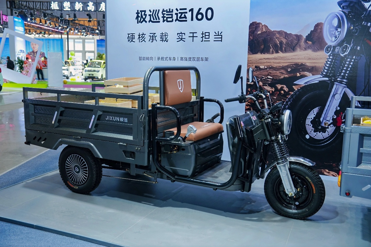 除了智能休闲三轮智悦系列外,极巡科技此次还展出了全篷代步、货运运载等品类产品。其中,全篷系列的极瑞01,双屏智控车机互联、4G远场全域互联、零重力舒享座椅、AutoHold智能驻防等核心配置,通过汽车级智能科技重构了全篷出行的新体验。货运系列则展出了铠运系列智能货运三轮车,该车型配备了变档电机、高强度车架与工程车厢,并支持刹车预警、智能转向等功能,不仅提升了载重与操控性能,也增强了驾乘操作的安全性与便捷性。