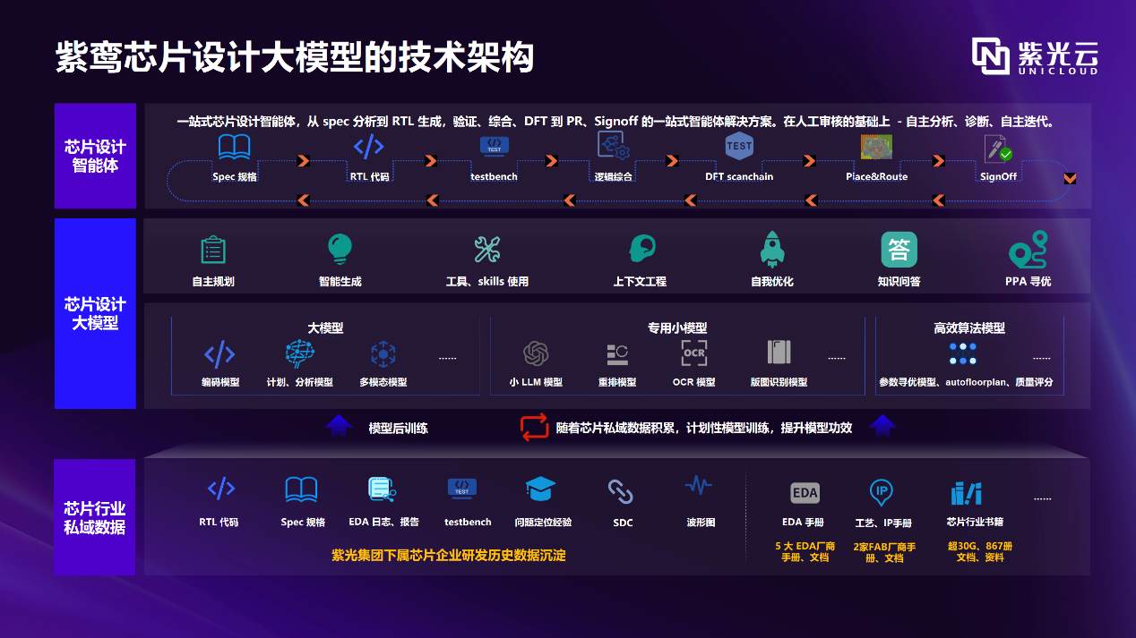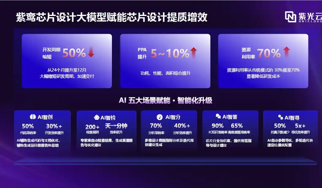 紫鸾芯片设计大模型运用“大模型+系列专用小模型+传统算法”架构,整合五大EDA厂商手册内容与紫光研发经验,有效缩短了芯片开发周期,大幅提升资源利用率。