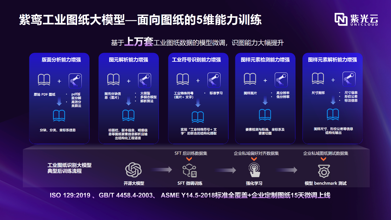 而紫光云此次发布的紫鸾工业图纸大模型,采用“版面分析—信息提取—图样解析—符号识别—标准引入”五步法,实现对PDF格式图纸的智能解析与结构化处理,确保信息提取的完整性与可追溯性。