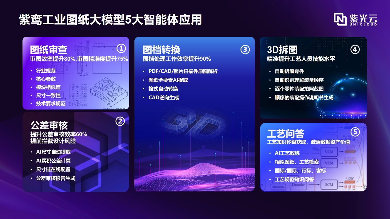 与之配套的是,紫光云这次还发布了五个行业智能体,可实现图纸审查、公差审核、图档转换、3D拆图和工艺问答等功能,进一步提升了行业应用的便捷性与实效性。