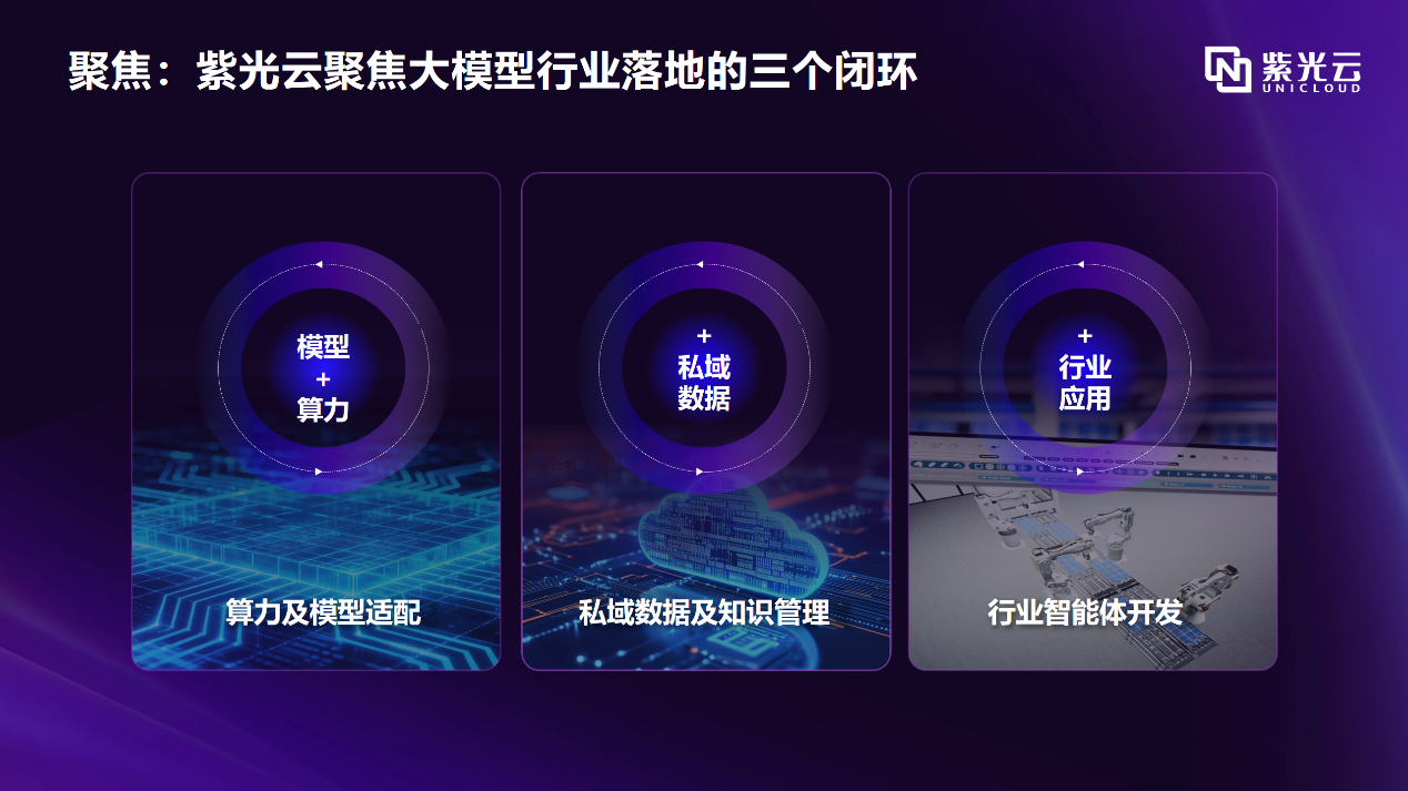 柳义利表示,行业大模型落地是一个系统工程,至少涵盖了四个维度要解决:算力、模型、私域数据、行业应用。紫光云认为,如果大模型要赋能行业,就要做好算力、数据、应用三大闭环。