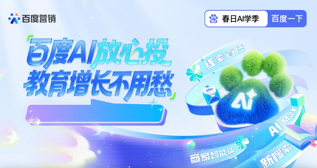 除商家智能体外,百度营销教育春招方案还通过多维度能力全面赋能机构增长。在流量拓展上,依托新搜索(搜索百看)打通搜索与内容场景,挖掘更多潜在流量机会,实现全场景爆量投;在投放提效上,AIMax积极探索等功能实现一键起量、智能优化,大幅降低人工操作成本,做到新能力省心投;在经营提效上,线索直播能力助力机构深化线索转化,打通从获客到转化的全链路,实现全时段放心投。