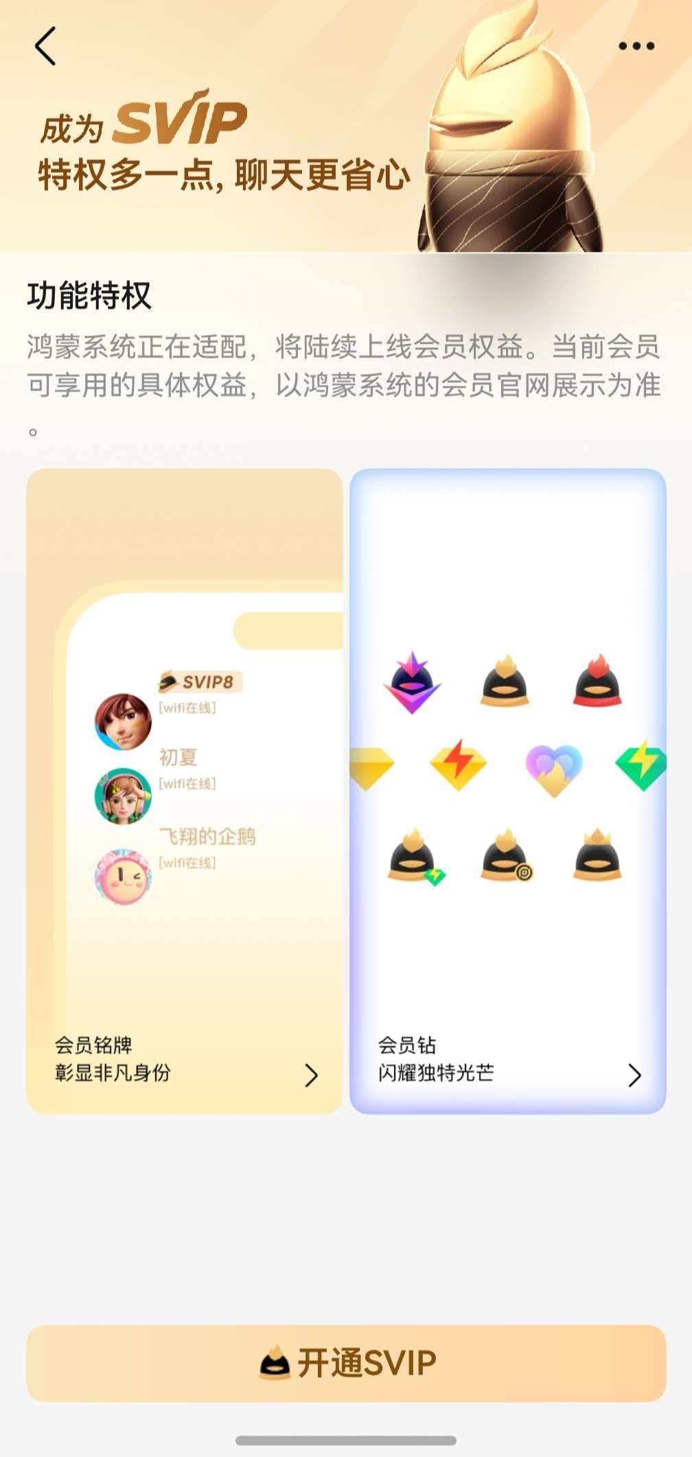 对于追求个性的Q友们也有好消息,会员中心正式入驻鸿蒙版QQ啦!现在你可以展示专属的会员铭牌与璀璨星钻。配合全新的频道发现页,无论是寻找同好圈子还是展示自我,在鸿蒙系统特有的流畅动效加持下,每一次点击都是视觉享受。