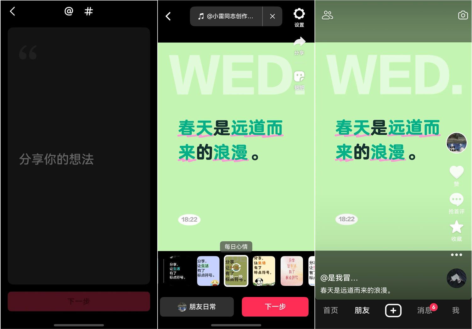 • 短视频创作:支持文字拍摄模式,随心记录心情想法,还可@好友、添加 #话题标签,纯文字内容也能拍出高级感、营造氛围感。