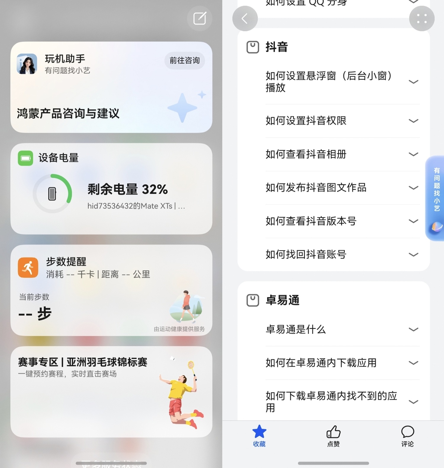 如果在使用过程中有疑问或者建议,可以右滑至华为负一屏,选择“鸿蒙产品咨询与建议”动态卡片,进入小艺对话界面进行提问或反馈。鸿蒙一指禅板块还有鸿蒙版抖音的专属指南,平时遇到的高频操作难题在这里都清晰罗列,点一下就能得到解决方法。