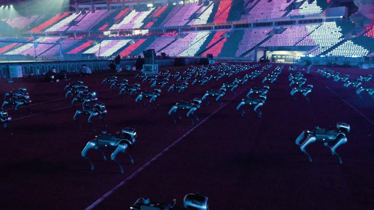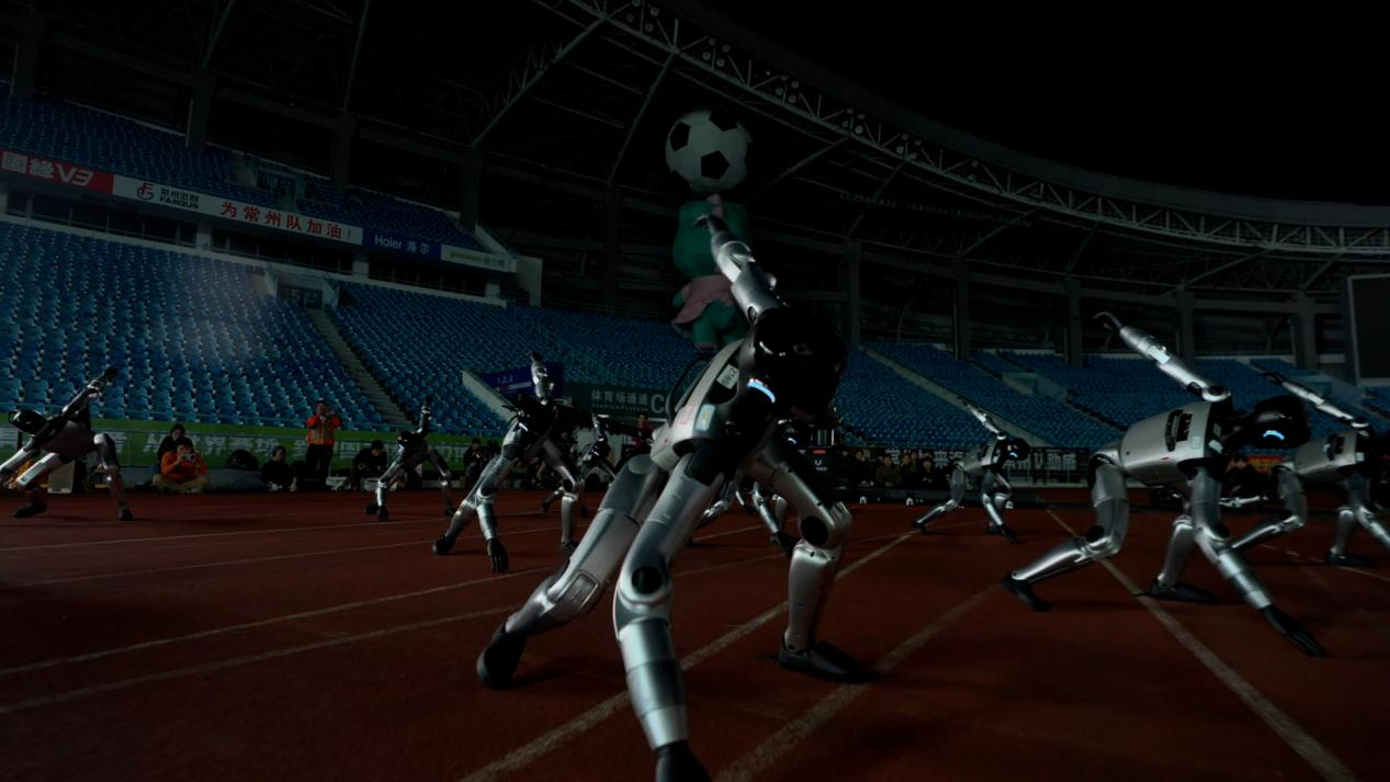 苏超开幕式当晚,常州奥体中心的草坪上,魔法原子机器人的雨中大秀成为整场开幕式的高潮之一。近300台四足机器狗与人形机器人同时亮相,分别组成两个表演方阵,在绿茵场上展开惊艳演出。