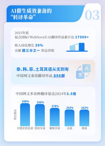 伴随世界性市场的形成,AI翻译的应用也”催生了一场质效兼备的“转译革命”。截至2025年底,仅起点国际(WebNovel)一家平台,累计AI翻译作品总数超17000部,收入同比增长39%,贡献了平台超三分之一的总营收。