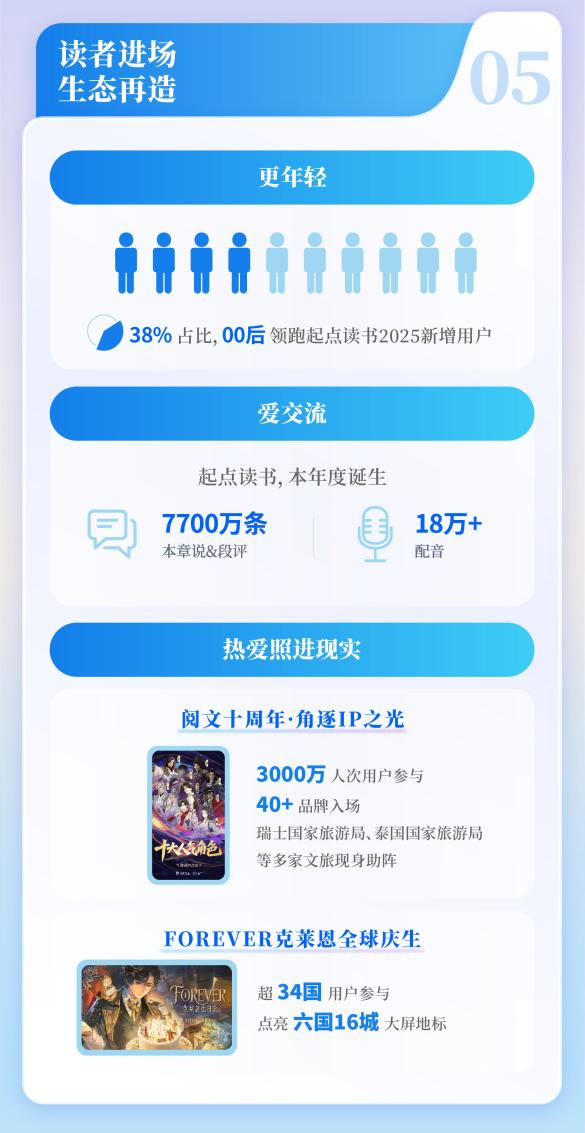 从读者端看,2025年起点读书新增用户中,00后占比达38%,成为最大群体。年轻的用户不满足于阅读,而是深度融入网文IP生态建设、内容传播与互动共创的全过程。数据显示,起点读书2025诞生了7700万条“本章说”与段评、超18万条作品配音。从日常的互动,到“阅文十周年·角逐IP之光”的3000万人次参与,再到“FOREVER克莱恩全球庆生”覆盖34国用户、点亮六国16城大屏地标,读者已成IP生态的深度共创主体。
