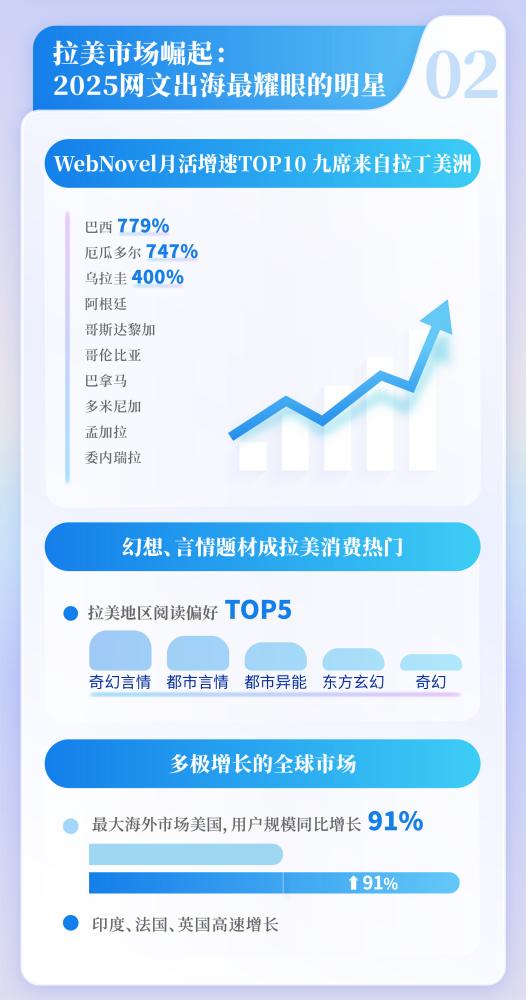 而“2025年网文出海最耀眼的明星”,无疑是拉美市场的崛起,在WebNovel(起点国际)全球月活用户增速前十名的国家中,有九个席位被拉美国家占据。其中,巴西市场以月活779%的增速领跑,其用户访问量也跃升了五位,最终和美国、印度包揽了全球前三。