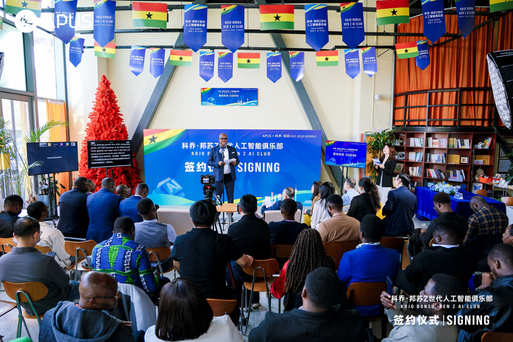 4月11日,APUS与加纳驻华大使科乔·邦苏在北京正式签署战略合作协议,并共同启动KOJO BONSU GEN Z AI CLUB。作为此次合作的核心技术与平台支持方,APUS以自身在人工智能领域的技术积累与全球化布局,携手加纳青年群体,推动一个集科技赋能与文化交流于一体的创新平台落地。
