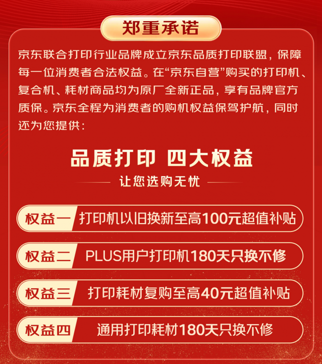 “京东品质打印联盟”不仅严控产品源头,确保用户在“京东自营”购买的打印机、复合机及耗材商品均为原厂全新的正品,享有品牌官方质保;更同步推出打印机以旧换新至高100元超值补贴、PLUS会员用户享打印机180天只换不修、打印机耗材复购至高40元超值补贴、通用打印耗材180天只换不修四大权益,全方位为消费者提升购机与使用体验。
