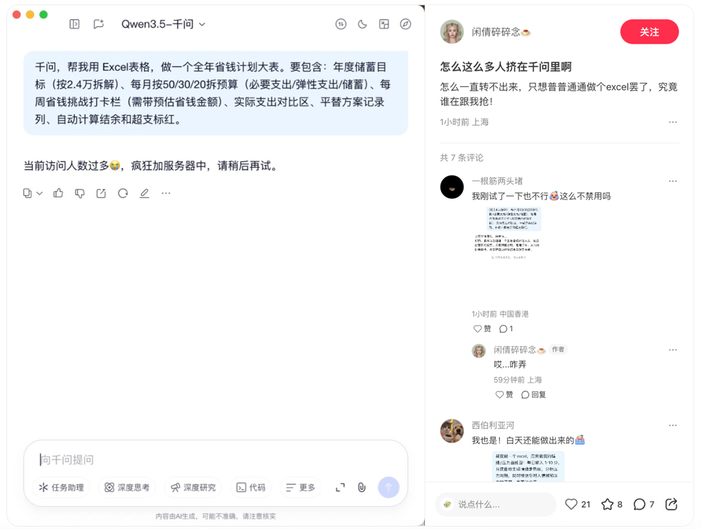 4月14日晚,多位网友在社交平台发帖反映千问Excel生成功能出现排队现象,系统提示”当前访问人数过多”。经过尝试发现该提示已取消,目前该功能已能正常使用。