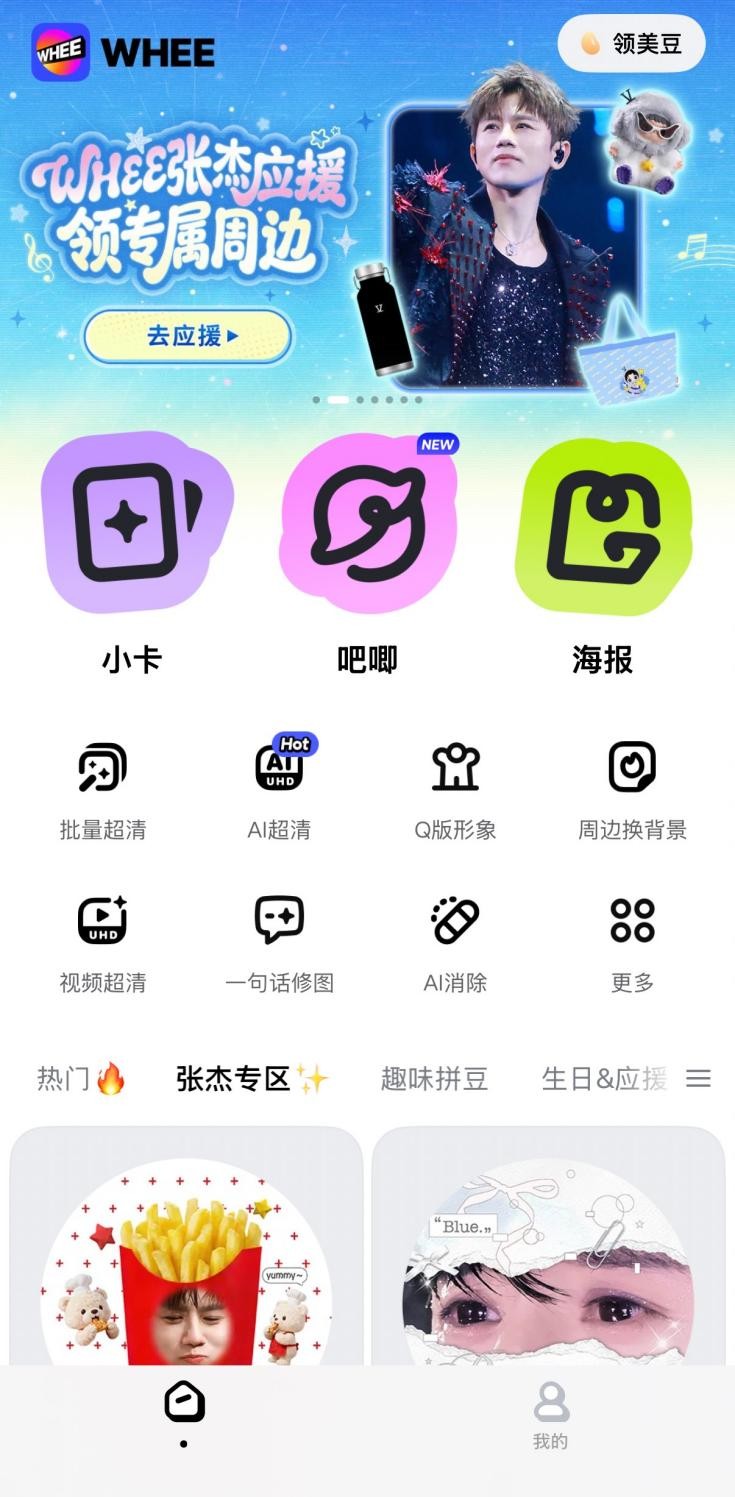 在此次联合应援计划中,针对张杰个人舞台风格与视觉符号,如“星空蓝”应援色、“逆战热血”热门歌曲等,WHEE推出一系列定制设计模板,粉丝通过简单指令即可完成个性化周边设计。此外,长期备受粉丝喜爱的WHEE“AI超清”功能,能够将演唱会现场因光线、距离等原因造成的模糊“废片”,一键修复为高清画质,高质量还原舞台细节。