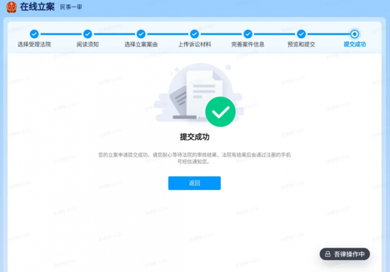 提交成功:完成上述步骤后,系统会显示"提交成功"提示。至此,您的立案申请已正式进入法院系统。