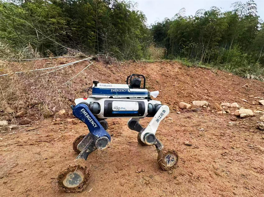 AI防汛勇士(云深处四足机器人山猫M20)亮相地质灾害隐患排查演练直播