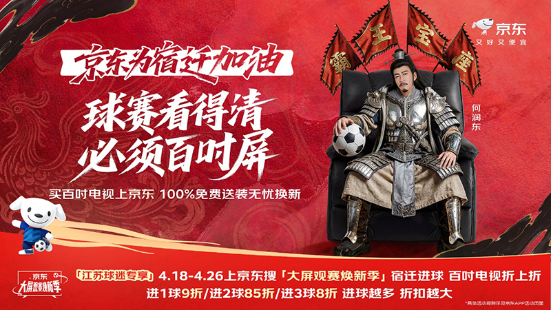 4月18日,宿迁队将迎来苏超新赛季首战。京东携手“西楚霸王项羽”的扮演者、著名演员何润东为江苏球迷送上专属福利。4月18日至26日期间,江苏球迷上京东APP搜索“大屏观赛焕新季”,即可解锁“宿迁进球,百吋电视折上折”优惠活动。在4月18日的宿迁队比赛期间,宿迁队进1球江苏球迷购买指定款百吋电视享9折优惠、进2球享85折、进3球享8折,进球越多,折扣越大! 同时还可享受京东提供的100%免费送装服务。