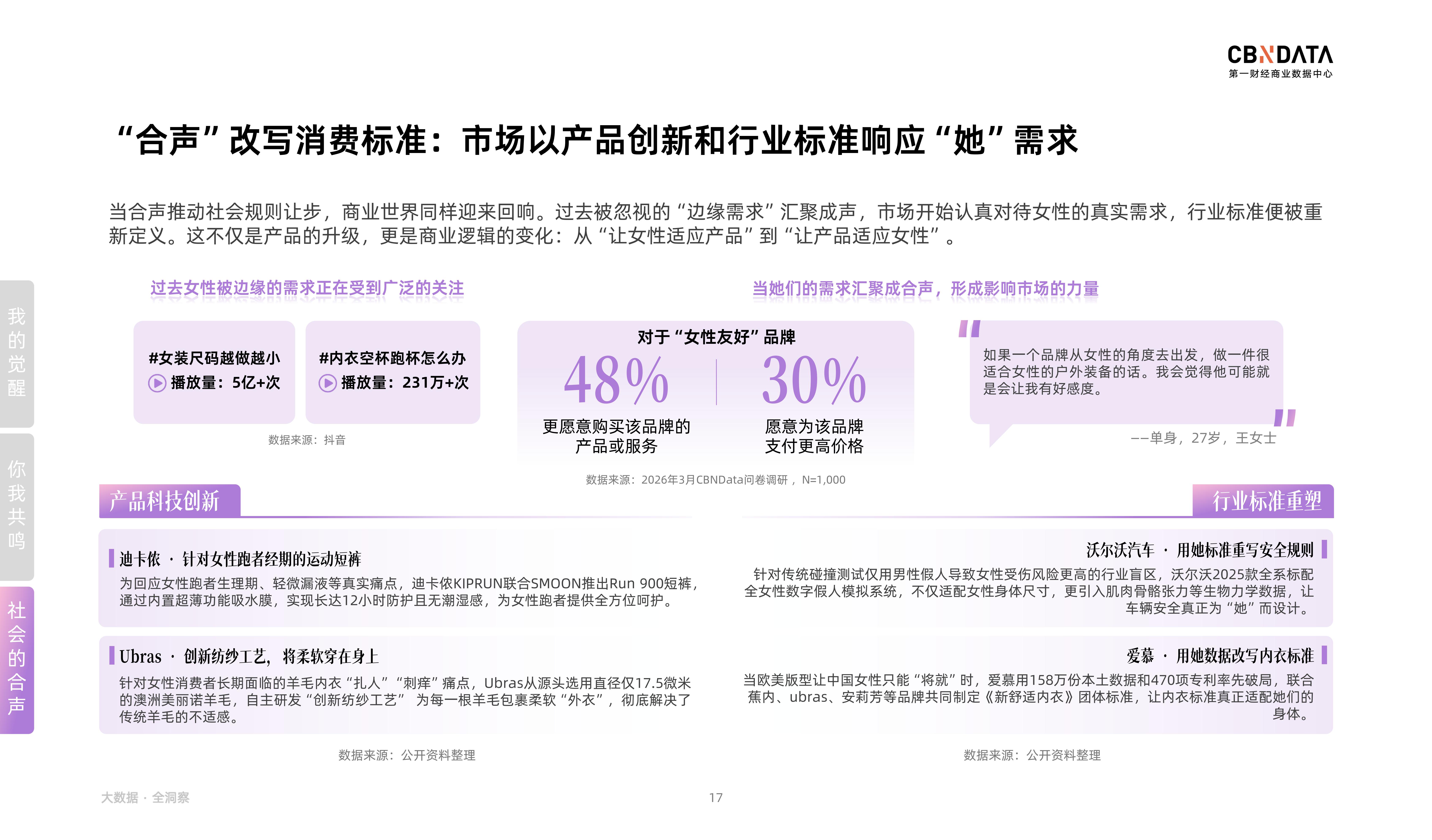 在此背景下,第一财经商业数据中心(CBNData)发布《我们的合声-2026女性品质生活洞察报告》(下称“报告”),系统梳理女性觉醒的底层逻辑与消费表达路径,揭示从个体选择到社会共鸣的完整闭环,为市场理解这一结构性变迁提供扎实的数据与洞察底座。