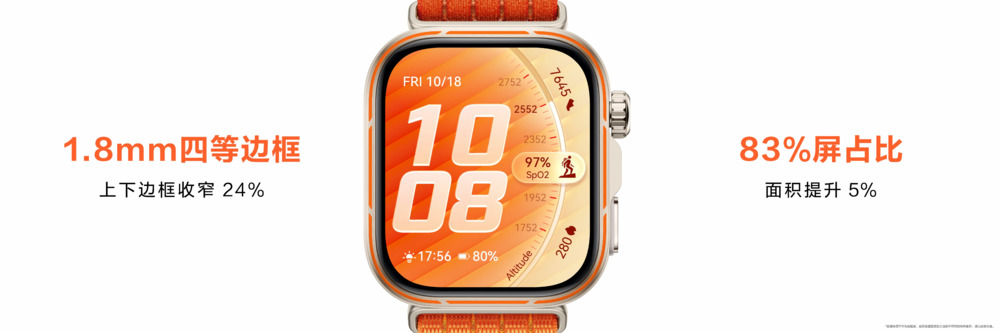 屏幕体验全面升级。HUAWEI WATCH FIT 5配备1.82英寸高亮大屏;HUAWEI WATCH FIT 5Pro屏幕升级至1.92英寸,边框缩至1.8mm极窄四等边,同时全局激发最高亮度升至3000nits,在强光下依然清晰。
