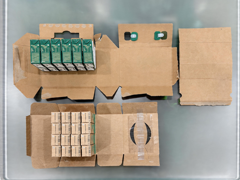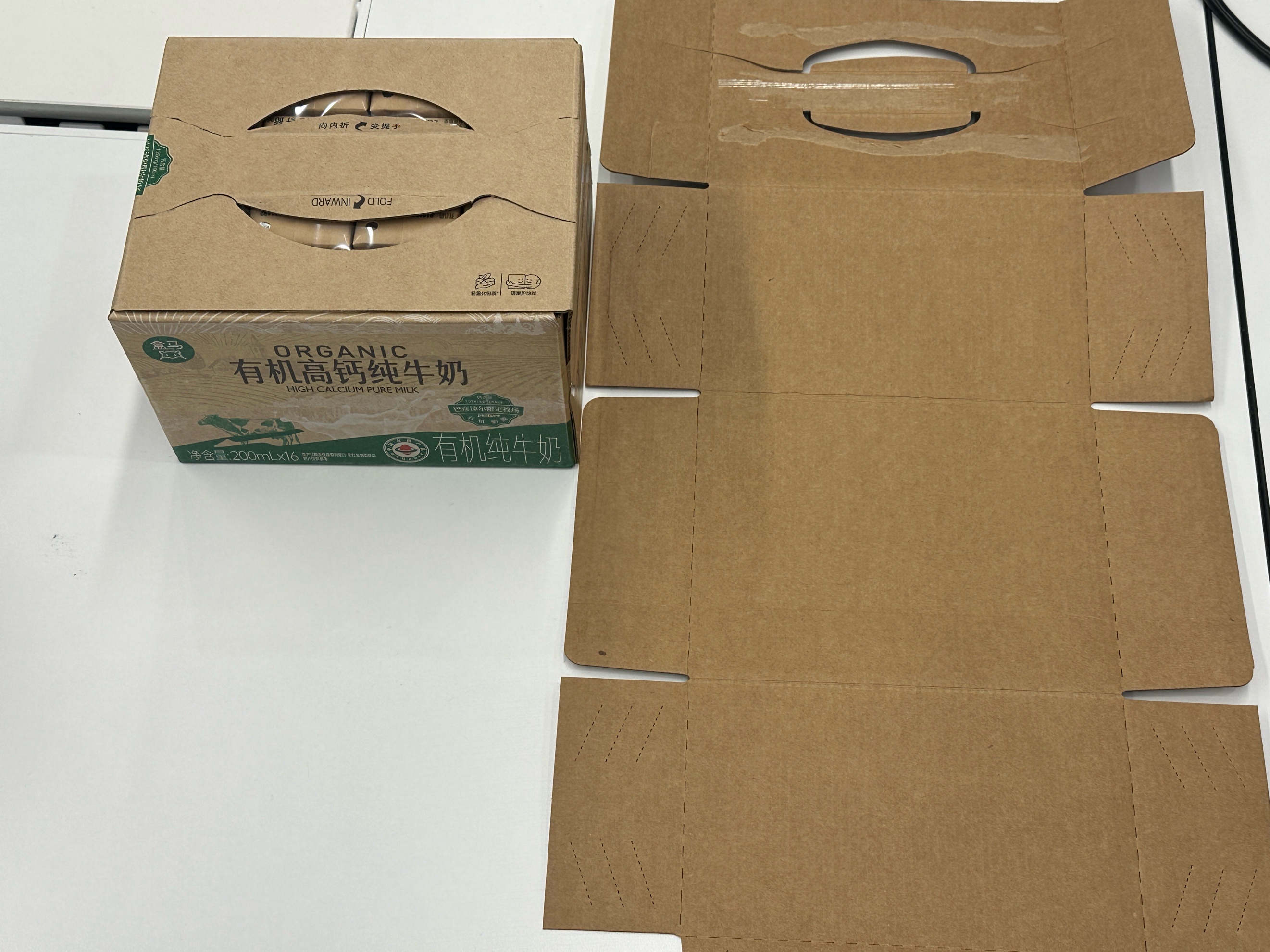 旧包装结构繁复,垫高加宽的硬纸板、突出的塑料提手、层层嵌套的纸盒以及外层塑料覆膜,导致拆解困难,回收不便。盒马团队借鉴一体式纸盒设计,选用可完全回收的俄罗斯进口防潮牛卡纸,为不同规格牛奶“量身定做”纸板,让纸盒展开两侧即可摊平,同时摒弃冗余内衬和底衬,仅保留必要的防尘PVC薄片。