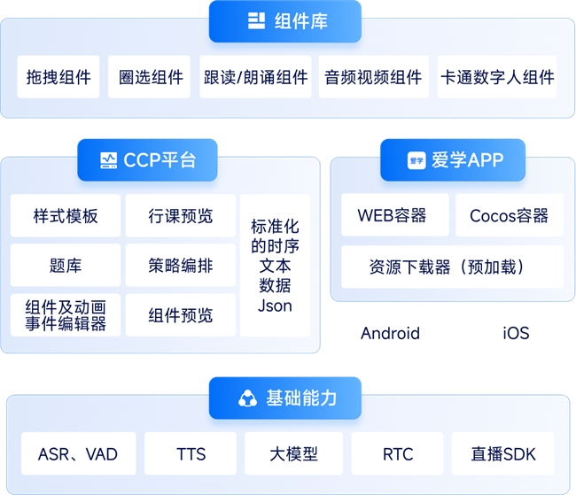在互动执行层,前后端架构选定CocosCreator + 组件化 + 低代码 + AI Agent架构,兼顾个性化教学能力与流畅的上课体验。