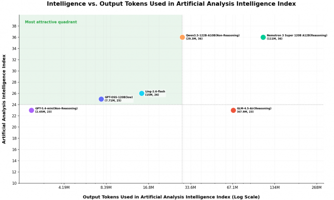 从 Token 消耗来看,Ling-2.6-flash 的智效比显著提升。完成同类测评任务时,Ling-2.6-flash 总Token消耗仅为Nemotron-3-Super 等同参数模型的1/10。
