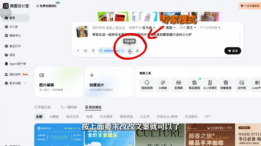 小应现场演示了保暖鞋垫AI商品套图的制作流程,通过美图设计室首页的电商商品Agent,输入相关参数与产品需求,平台便会智能分析产品信息,等待十几秒,就能生成全套商品图和物料。