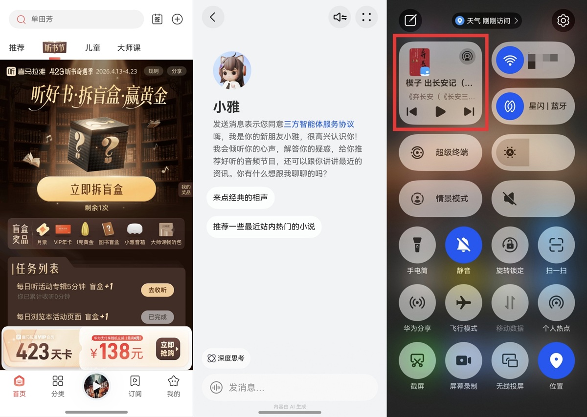 • 小艺推荐,懂你所听:喜马拉雅的小艺会根据你的喜好,主动推荐“423听书奇遇季”的优质专辑。小雅智能体与小艺的深度协同,让你从选书到听完,只需自然对话。