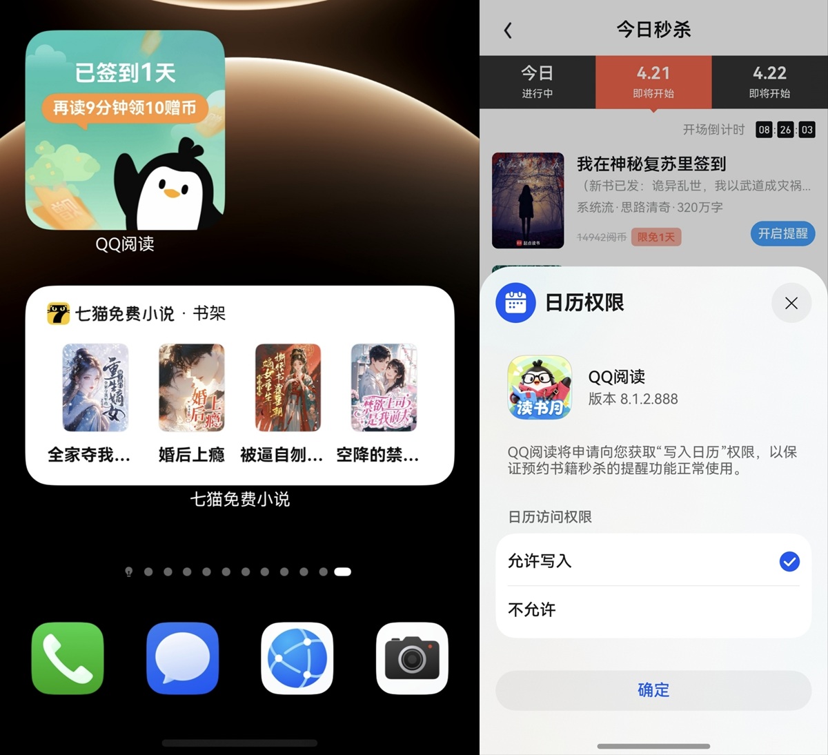 • 贴心提醒,不错过每一刻:七猫免费小说的桌面服务卡片可以一键领取“每日赠币”。面向鸿蒙端用户的免广告阅读福利(4月24日截止),加上手机与平板之间的应用接续无缝流转,阅读不中断,体验更专注。