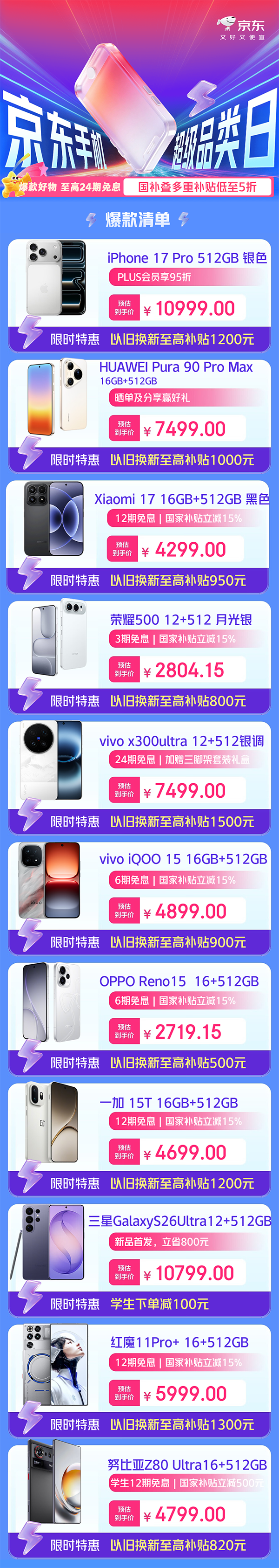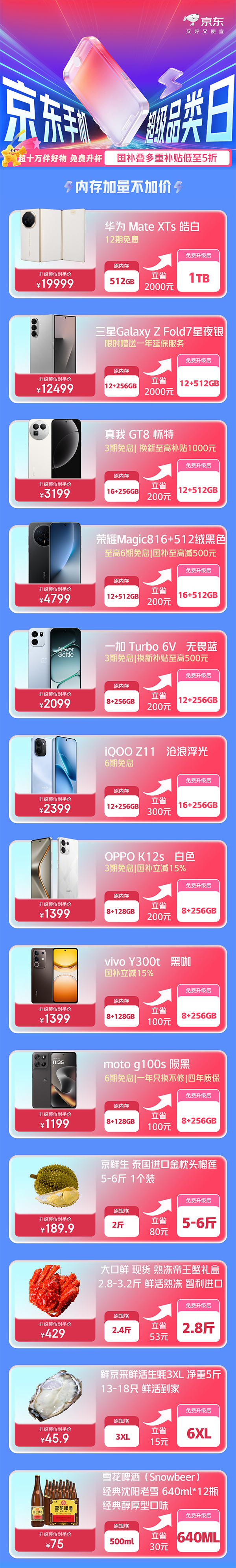 近日,在华为Pura系列及全场景新品发布会上,余承东直言:“大家早点买,内存价格疯狂,我们要是扛不住了以后也有可能涨价”,引发行业广泛关注。这番话折射出2026年手机行业的整体态势,终端涨价已逐渐成为趋势。与此同时,随着五一假期临近,用户对大内存手机的需求持续攀升,无论是4K旅行拍摄、Vlog创作,还是城市“ColorWalk”街拍等高频使用场景,都对手机的存储容量与运行性能提出了更高要求。为助力消费者低成本换新,近日京东启动“手机超级品类日”,重磅推出“内存加量不加价”专项活动。消费者购买指定机型,即可免费升级至更高内存版本,如512GB升至1TB、256GB升至512GB,价格不变,真正实现“加量不加价”。同时,活动叠加国补等多重补贴福利,部分热门机型到手价低至5折!