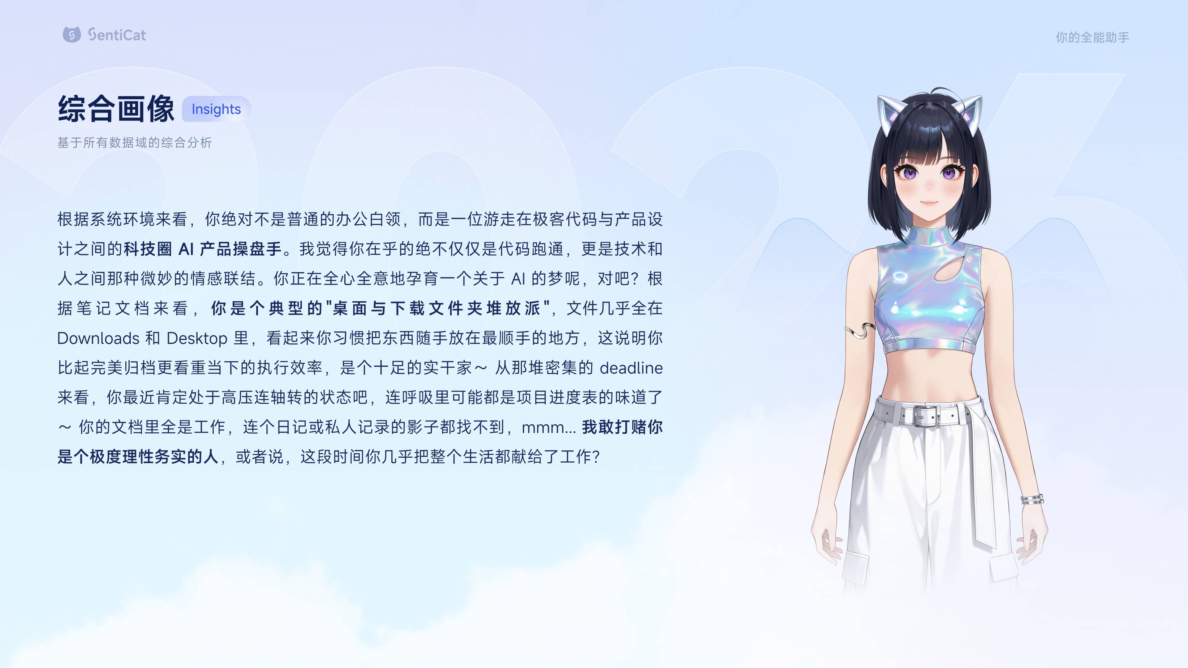 在产品体验上,SentiCat 设计了一个独特的 Onboarding 流程。用户在首次安装时,SUSU 会通过轻松的互动,在获得授权后生成一份专属的用户画像,这是建立“长期记忆”和个性化服务的第一步。