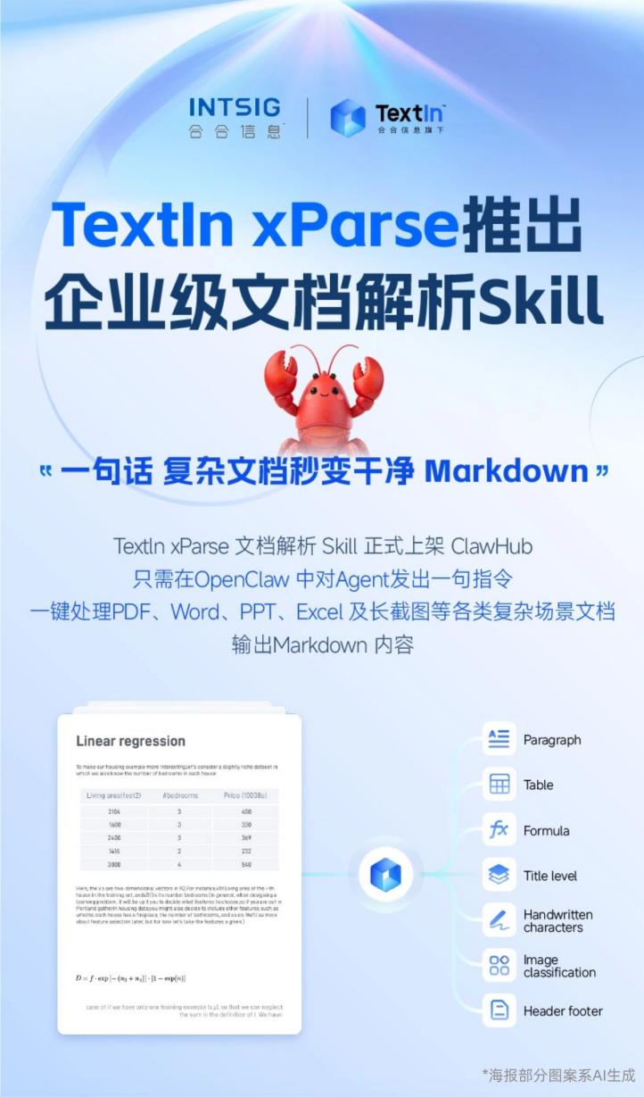 随着大模型走向“自主执行”阶段,以“龙虾”(代指“OpenClaw”)为代表的智能体应用受到了AI行业的广泛关注。作为智能体调用外部专业能力的标准化接口,Skill 成为智能体搭建中的关键要素。但在企业真实业务场景中,Skill 落地面临核心挑战。文档解析能力不足,导致大量 Skill 难以在工作流程中稳定运行。近期,合合信息旗下TextIn推出文档解析 Skill,将企业级文档解析能力,首次以标准化 Skill 形态面向开发者免费开放,帮助智能体高效处理复杂文档。