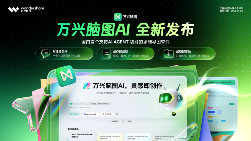 近日,AIGC软件A股上市公司万兴科技(300624.SZ)不断深化AI Agent在知识管理与办公提效场景的布局,旗下绘图创意软件万兴脑图(原亿图脑图)继日前开启手绘模式公测后再度升级,正式上线对话驱动型AI知识工作台功能——万兴脑图AI,成为国内首个支持AI Agent功能的专业思维导图软件。