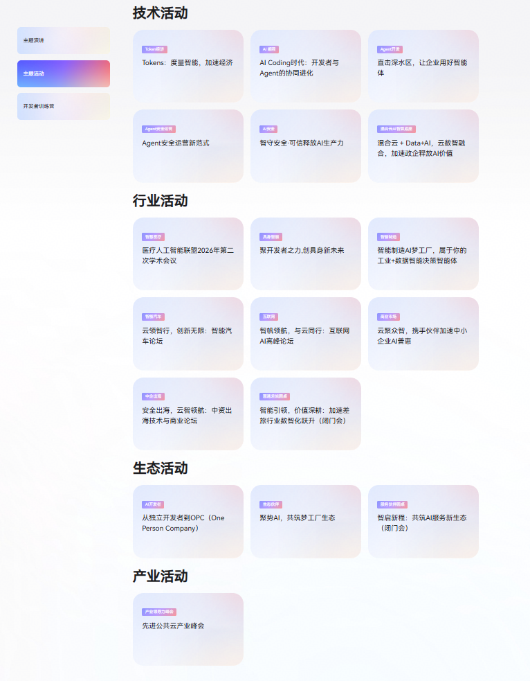 大会携手公共云产业联盟、AiDD、360、瑞金医院、CSDN等机构,举办覆盖产业、技术、行业、生态四大方向的百场论坛。产业论坛将深度探讨AI与公共云的下一跳关键发展方向;技术论坛将拆解Token经济、AI Coding、企业级Agent开发等热点;行业论坛直面智慧医疗、具身智能、智能制造、智能汽车等垂直场景的AI落地挑战;生态论坛及开放麦则让开发者与生态伙伴成为主角,分享创新实践。
