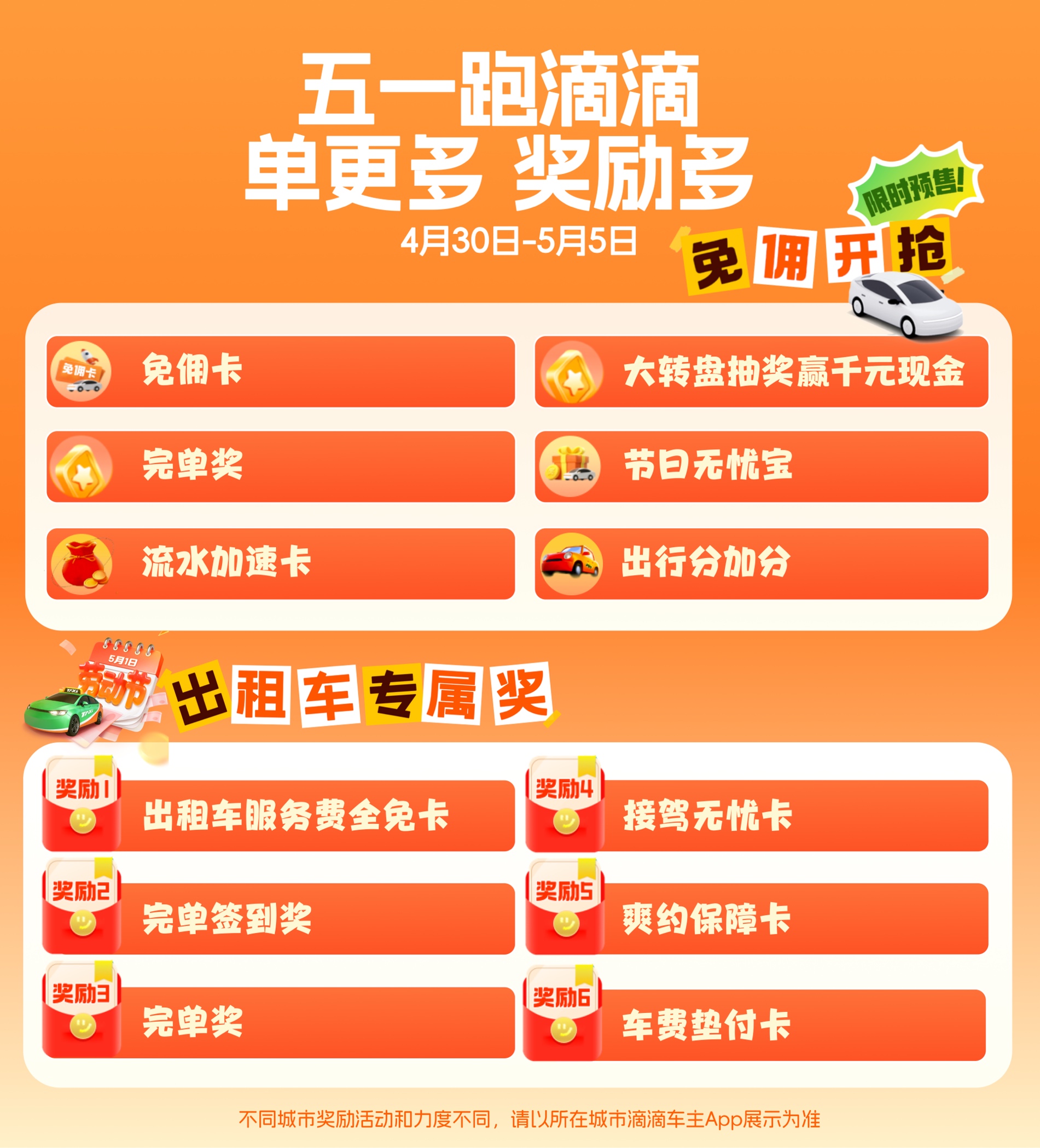 假期出行需求增加,为满足用户的用车需求,滴滴将发放近4亿元司机补贴,推出免佣卡、流水加速卡、完单奖、节日无忧宝和大转盘抽最高1000元现金红包等多重奖励活动,向假期坚守的司机师傅们致敬。滴滴拼车还额外准备了拼车专属单单奖、流水加速卡等多样奖励,助力师傅们多拼多赚。滴滴出租车也将上线服务费全免卡、签到奖、完单奖、接驾无忧卡、爽约保障卡、车费垫付卡等多重奖励和保障活动,帮助师傅们在假期能够单多收入多。不同城市活动和奖励内容不同,师傅们通过所在城市滴滴车主App查看具体活动详情。