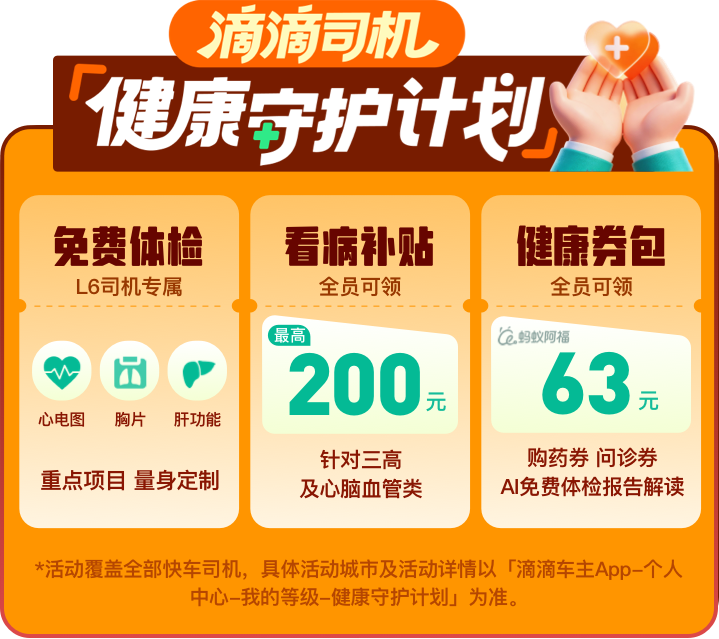 滴滴始终关注司机师傅的健康,于4月升级了“滴滴司机健康守护计划”,为全国快车司机提供针对三高及心脑血管问题的季度健康补贴。同时,滴滴联合互联网健康平台,首批与蚂蚁阿福合作,为司机提供在线问诊和线上购药优惠。部分城市的L6 高等级司机还可享价值300元的年度免费定制体检。