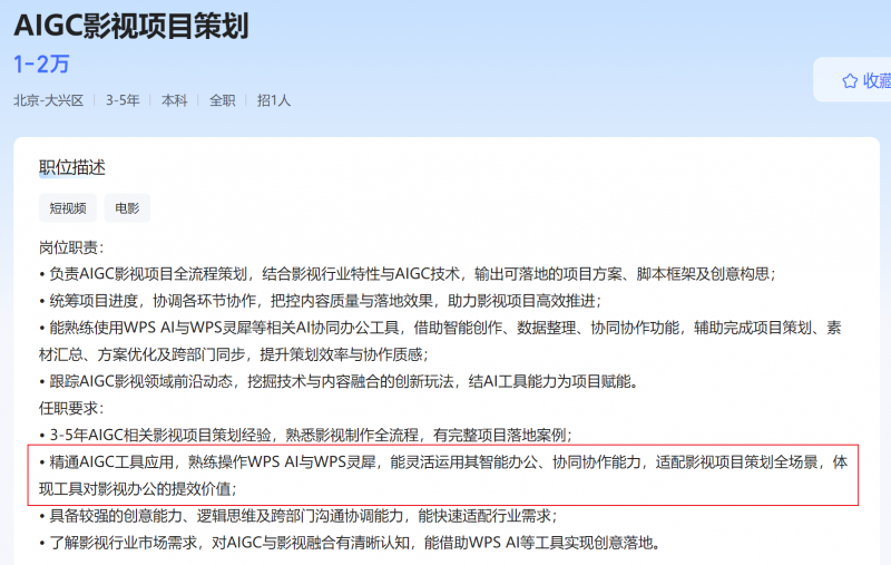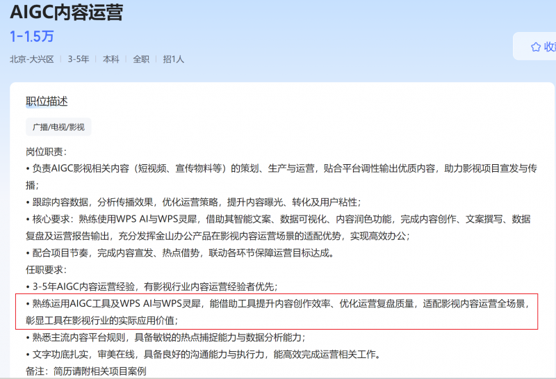 记者注意到,一家名为北京同方嘉映数字电影院线有限公司近日在招聘平台发布了两个AIGC影视岗位——“AIGC影视项目策划”和“AIGC内容运营”,除了要求一定的相关领域工作年限,有影视行业内容运营的成熟经验,熟悉主流内容平台规则等,任职要求还点明了工具:熟练运用WPS AI与WPS灵犀者优先。不是泛泛提一句“熟悉AI工具”,策划岗的职位还要求候选人需要“借助AI智能创作、数据整理、协同协作功能,辅助完成项目策划、素材汇总、方案优化及跨部门同步”。运营岗同样写得明确:需要用WPS AI完成“智能文案、数据可视化、内容润色”。