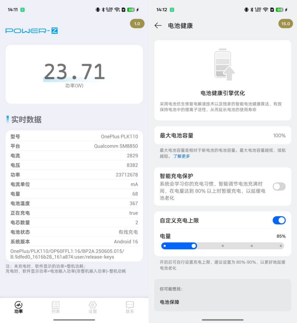 一加15本次将充电和续航完全拉满,首先7300mAh的超大冰川电池采用新一代仿生球碳硅材料与X25双电芯架构,含硅量高达15%,实现814Wh\L的能量密度,更是配备120W SUPER VOOC闪充,相比此前的100W充电提升40%的速度,并且加入更多的充电场景,比如喜欢使用无线充电的用户,也就是说无线有线都能实现充电自由。当然一加15的电池管理依然可以学习用户的使用习惯,或者自定义充电上限以达到保护电池的目的。