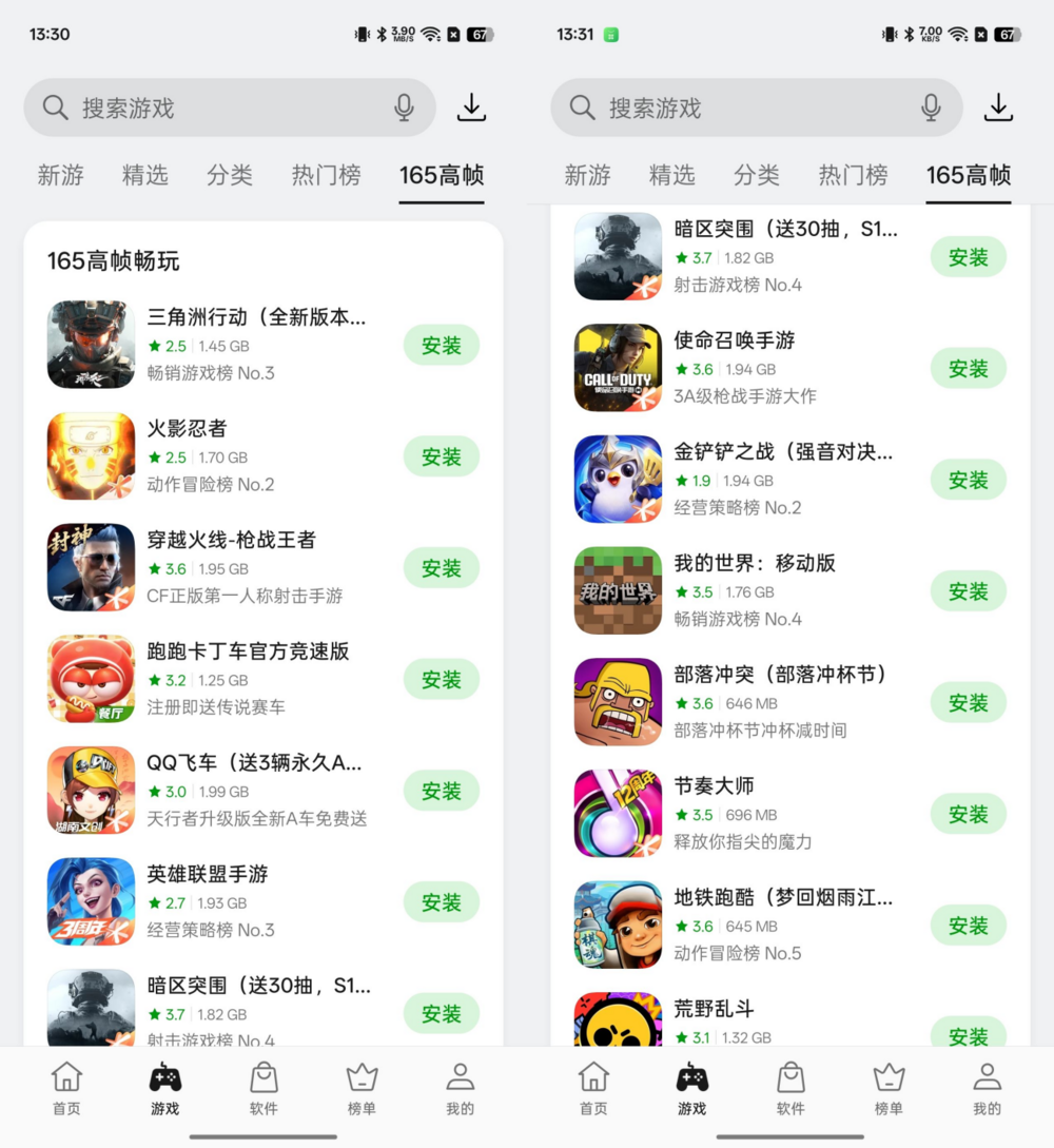 而说到这个165Hz的体验,目前一加的应用商城里面已经带来了165hz专区,热门游戏已经适配了这个模式。