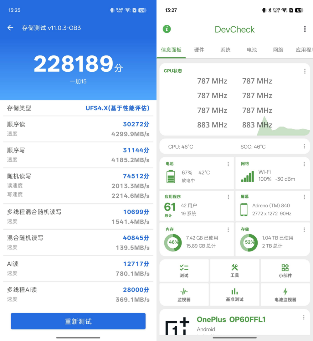 一加15的性能体系以硬件旗舰级+优化芯片级为核心,通过第五代骁龙8至尊版移动平台+顶级存储组合+自研技术的深度协同,将性能转化为全程满帧体验,一加15搭载LPDDR5X Ultra内存+UFS 4.1闪存的旗舰级存储组合,可以看出它的闪存性能读写全部突破4.2GB/S。