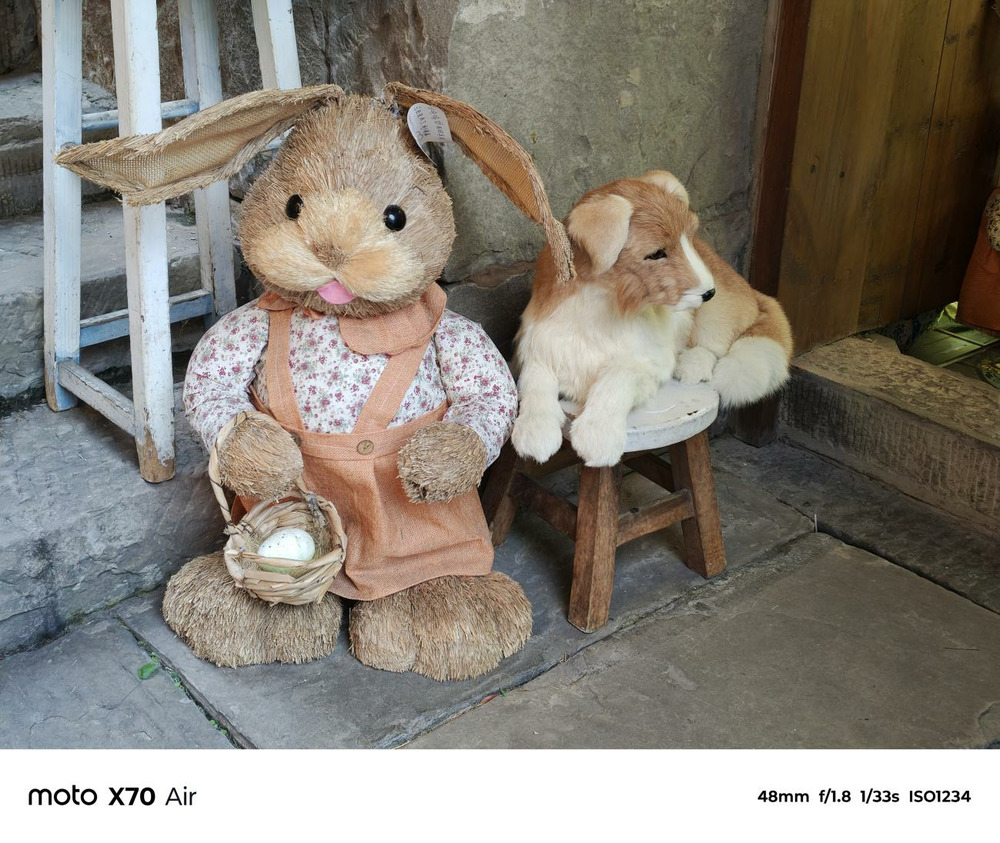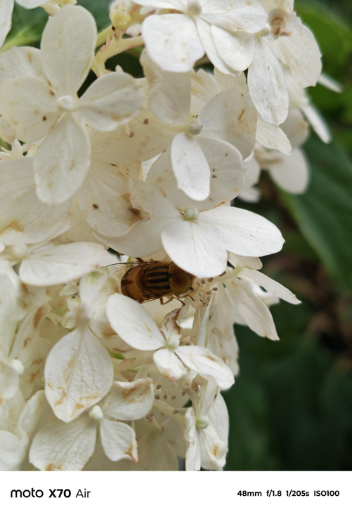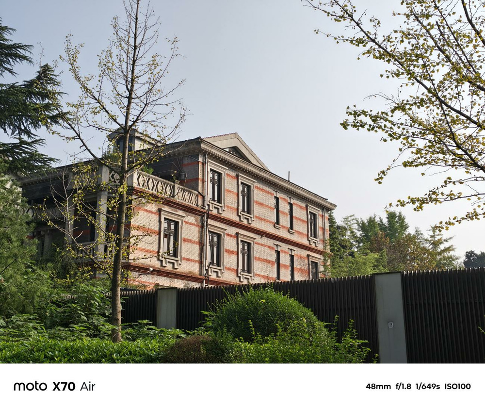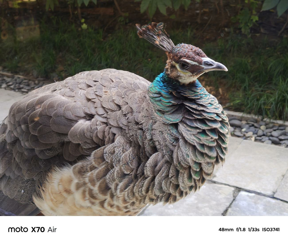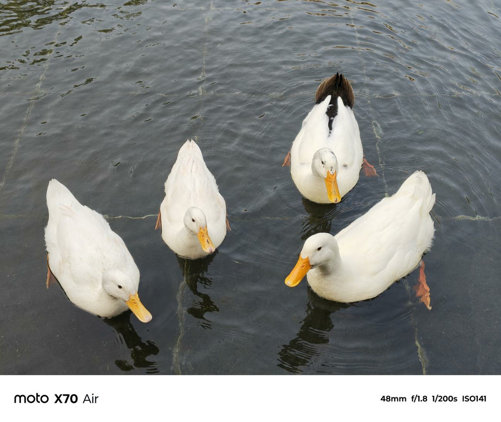 moto X70 Air影像系统在算法的加持下,还是有非常大进步的,从动物动态到微距细节,从静物质感再到建筑风光,每一处都彰显着它的进步。游鸭样张中,水面波纹的细腻起伏与鸭子羽毛的蓬松质感被同步定格,白色羽毛的纯净度与黄色喙部的色彩饱和度恰到好处,孔雀样张则展现了复杂纹理的解析力,颈部羽毛的蓝绿色金属光泽层次丰富。蜜蜂与绣球花的微距样张中,蜜蜂的条纹纹理、翅膀的透明质感,以及花瓣上的斑点与褶皱都被极致放大,背景虚化过渡柔和。老建筑样张中,砖石的纹理、窗户的线条锐度在线,周围绿植的层次感与天空的渐变过渡自然。