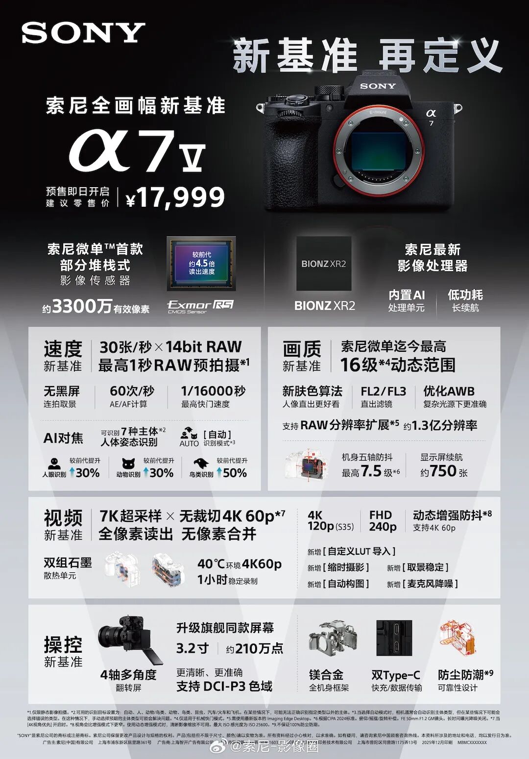 DoNews12月3日消息,索尼中国正式发布全画幅微单新基准 Alpha 7 V,其型号为 ILCE-7M5,即日开启预售,建议零售价为 17999 元。