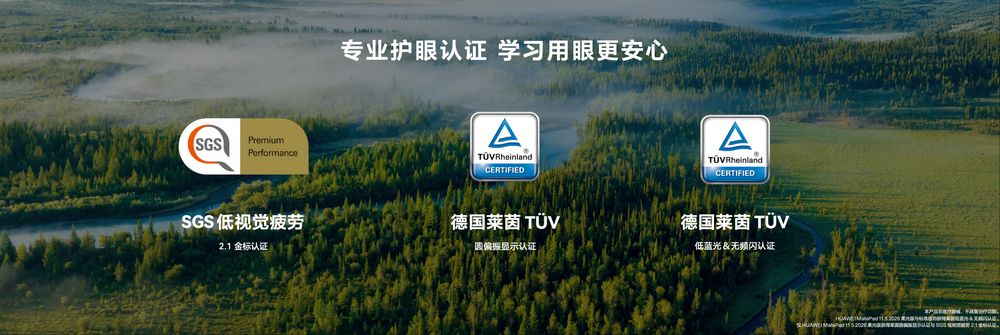同时,新品引入“类自然光护眼显示”,通过圆偏振技术模拟自然光的光学特性,主动优化屏幕发光,减少对眼睛的定向刺激,有效降低视觉疲劳程度。目前,华为MatePad 11.5柔光版已获得包括SGS低视觉疲劳金标2.1、德国莱茵圆偏振光显示以及硬件级低蓝光无频闪在内的多项权威认证,为持久健康的学习体验提供了可靠保障。