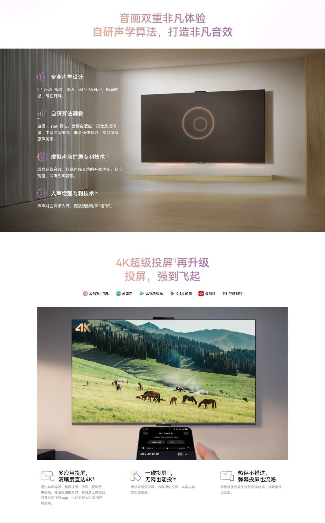 华为Vision智慧屏 5 SE的智慧交互功能,覆盖独处、聚会、异地团圆等多元场景,4K超级投屏无需在电视端安装APP、开通会员,只要手机有对应会员,即可实现4K超清投屏,延迟近乎无感。