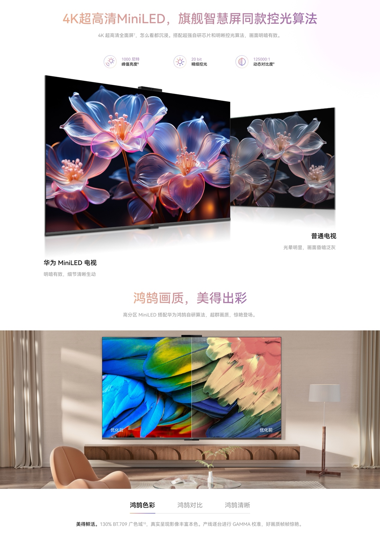 在此基础上,华为自研的鸿鹄画质技术从色彩、对比度、清晰度、流畅度、护眼五个维度全面优化。130% BT.709广色域搭配3D-LUT电影级映射算法,色彩过渡自然无断层,带来极强的色彩还原力。
