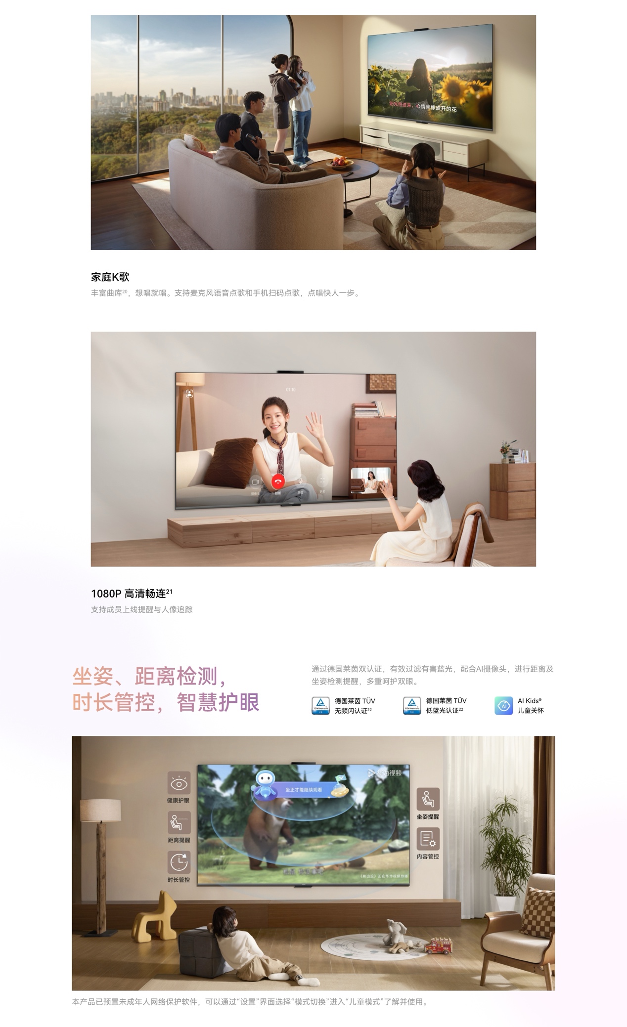 双重降噪与超分SR技术让画面细节纤毫毕现,老旧影片也能即可清晰。其支持原生120Hz刷新率+倍频240Hz,配合MEMC智能运动补偿算法,高速运动画面无拖影、无抖动,观看球赛、畅玩主机游戏时,丝滑流畅的视觉体验减轻眼部疲劳,而且智慧屏还通过莱茵低蓝光与无频闪双重认证,长时间观看也能带来健康护眼。此外搭配AI摄像头的坐姿、距离检测提醒,对于孩子观影、娱乐、上网课,家长也能放心。
