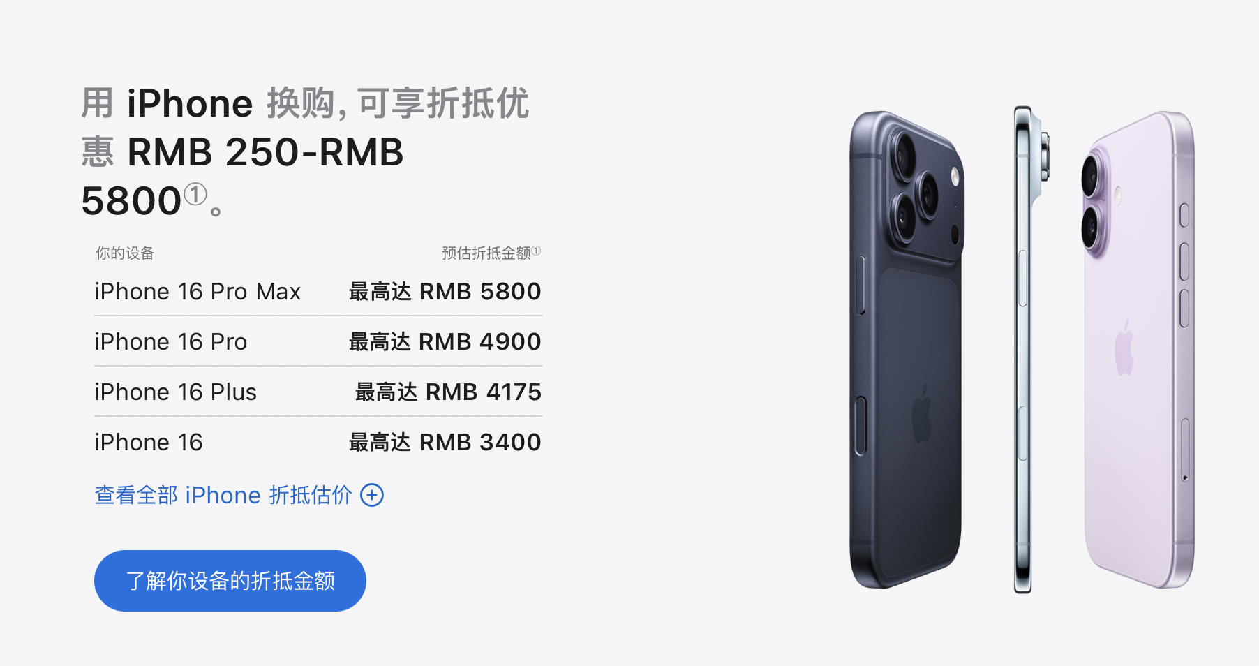 据苹果官网,折抵换购服务由Apple的折抵服务合作伙伴提供。折抵金额报价仅为预估价,实际折抵金额可能低于预估价值,具体金额取决于设备的状况、配置、推出年份,以及发售国家或地区。年满18周岁及以上者才可参与本计划。