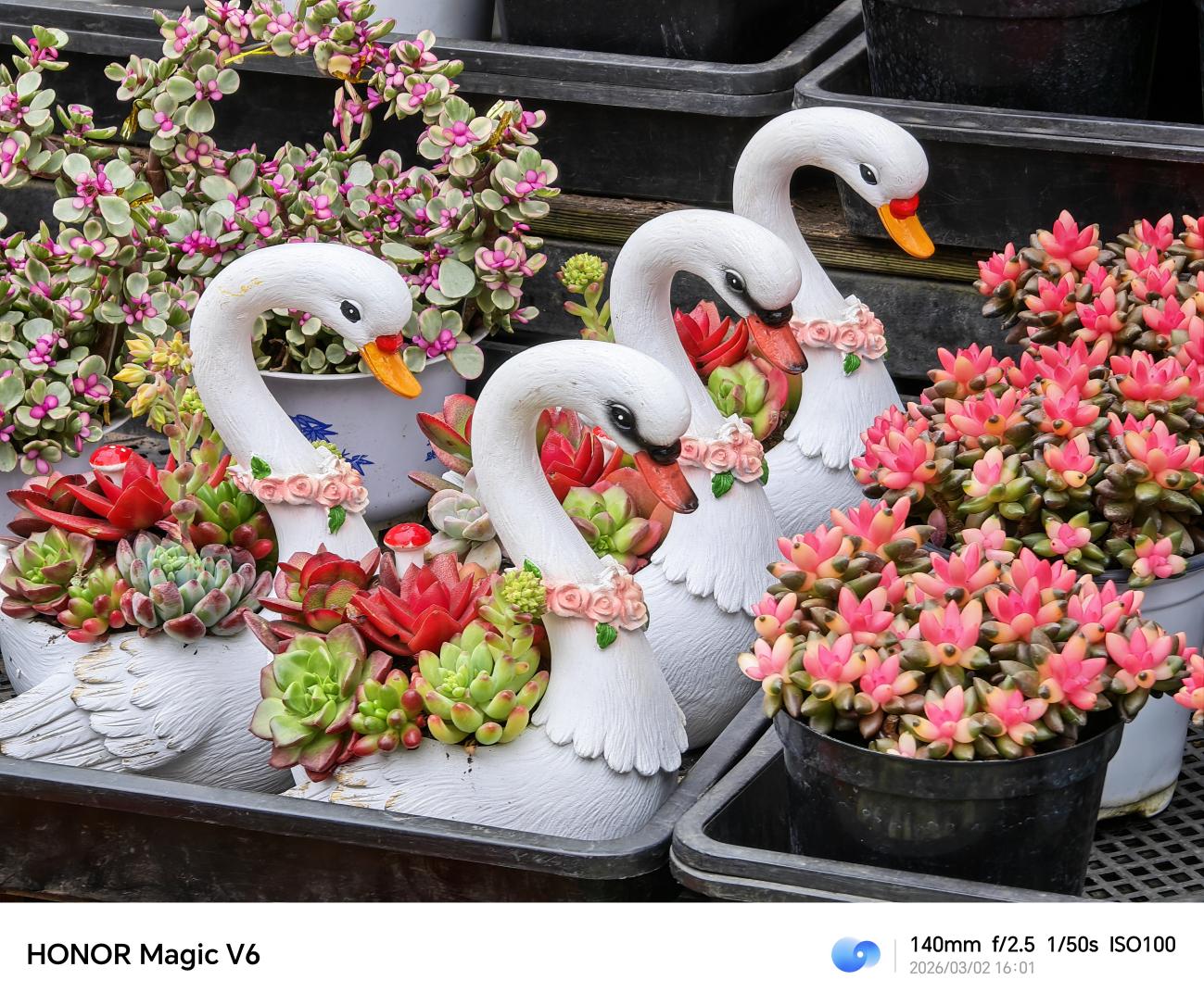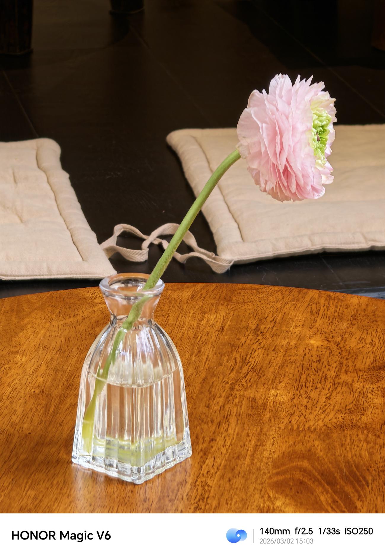 在室内暖光环境下,人像样张整体色调温暖柔和,红色毛衣的饱和度控制得当,与背景灰色墙面、暖黄花瓶形成和谐对比,HONOR Film滤镜自带的胶片质感,让画面多了一层温润的颗粒感,70mm焦段搭配 f/2.5光圈,带来柔和自然的背景虚化效果,前景的花瓶、花朵与人物形成层次对比。