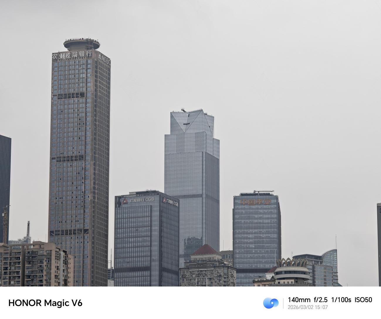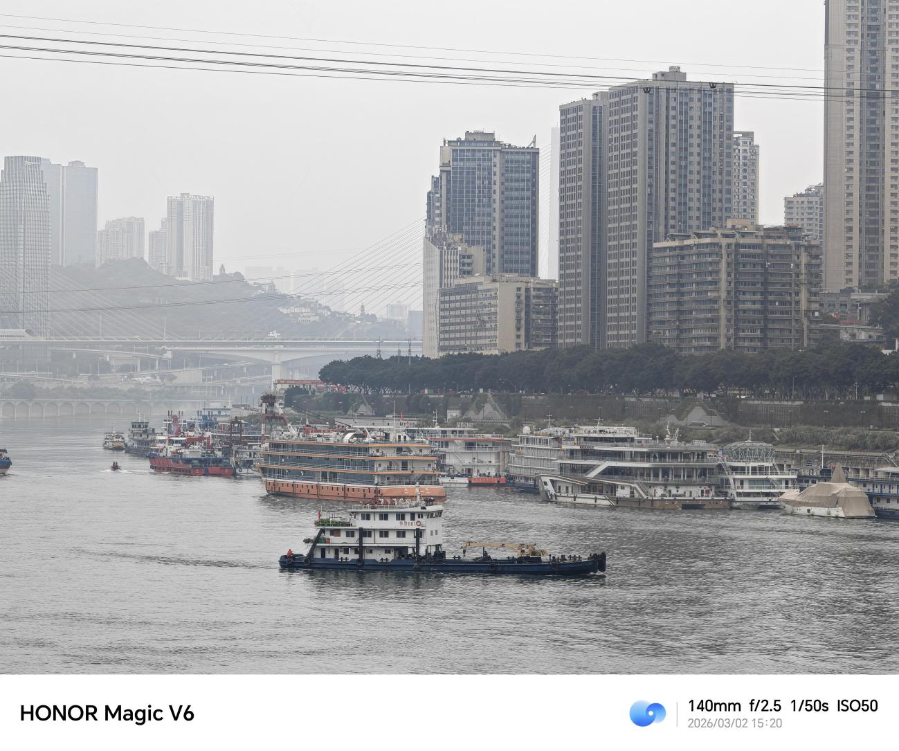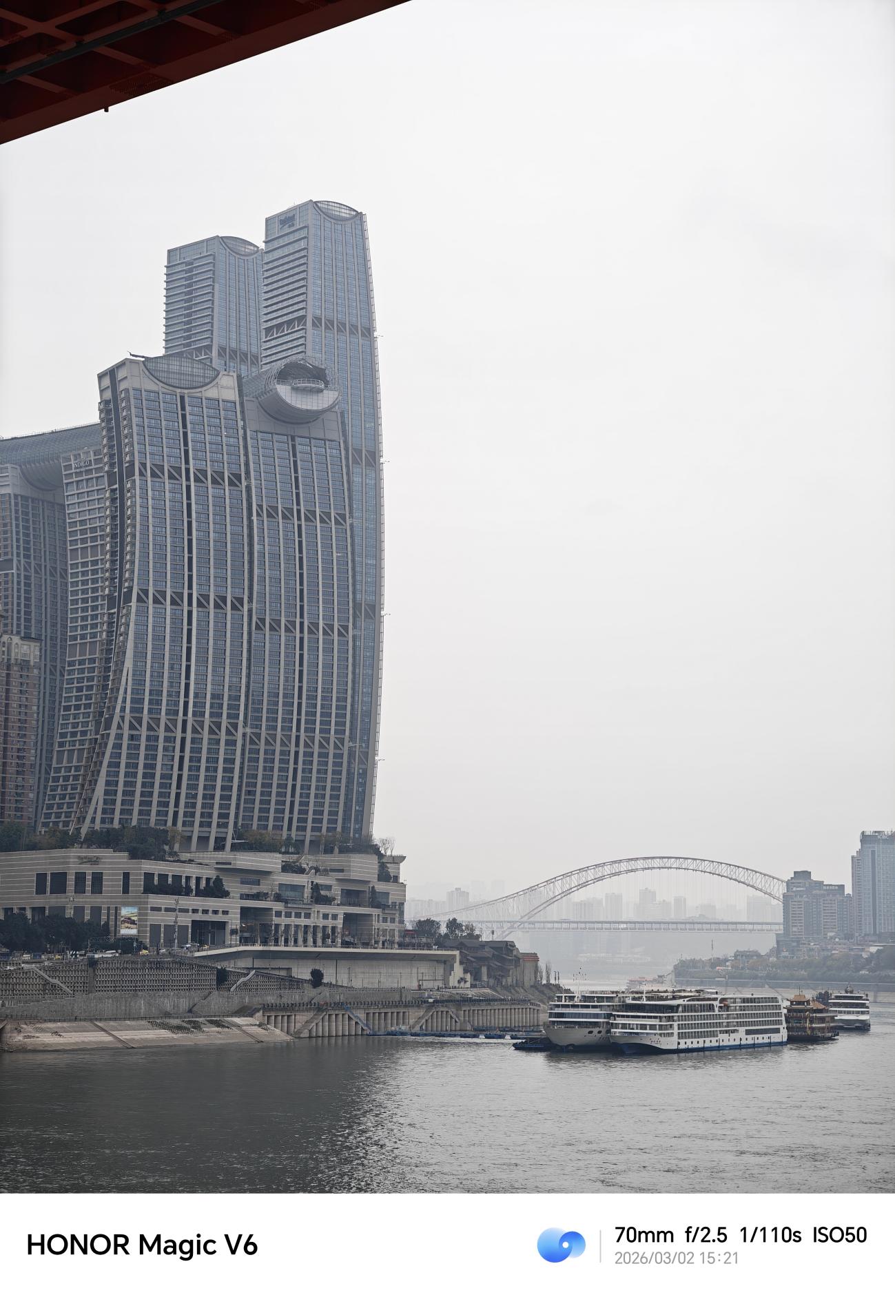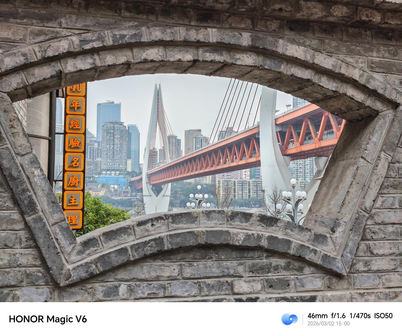 在阴天的城市环境下,主摄对整体氛围的把控很到位,画面没有出现过曝或死黑,天空的灰度层次过渡自然,江水和建筑的色彩还原真实,没有过度饱和。透过石窗的框景构图,建筑的线条、钢架结构的纹理都清晰可见,边缘锐度控制得很好,在明暗对比不算极端的场景中,高光和暗部都保留了不错的细节。